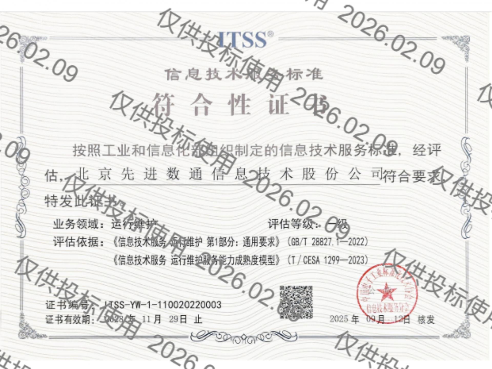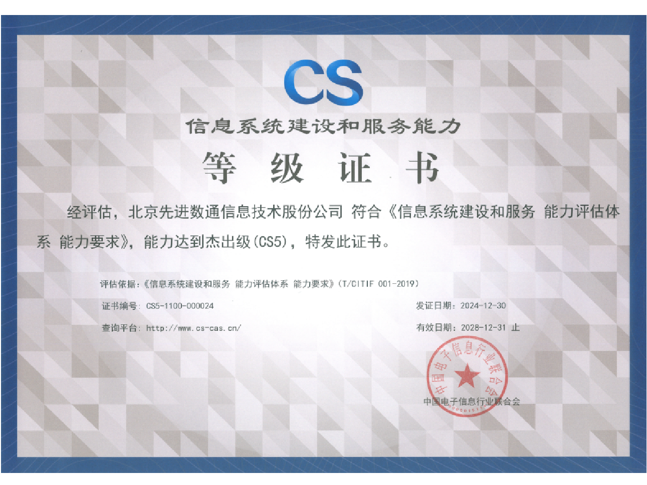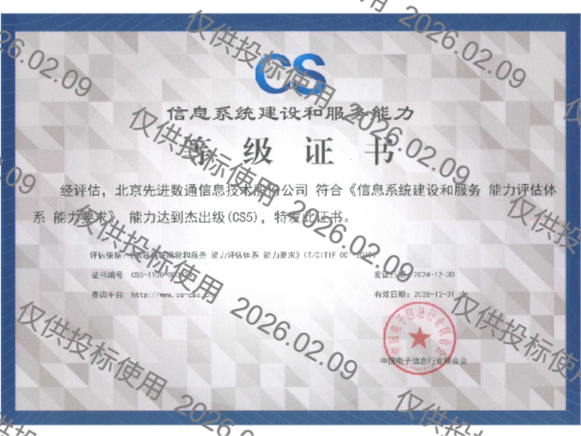 云配查 先后取得CMMIL5、软件能力成熟度五级(SPCA 5)、信息系统建设和服务能力评估体系(CS)5级、ITSS成熟度一级、信息系统安全集成服务资质二级、信息系统安全运维服务资质二级、国产化信息系统集成和服务能力评估四级(LS4)、北京市企业技术中心等资质认证,并取得ISO9001、ISO20000、ISO27001、ISO14001、ISO45001、ISO22301、ISO37001、ISO28001、GBT29490等标准体系认证,具备行业领先的技术开发、工程实施及服务保障能力。